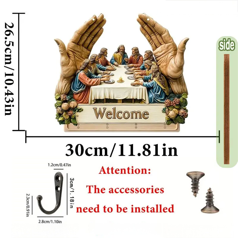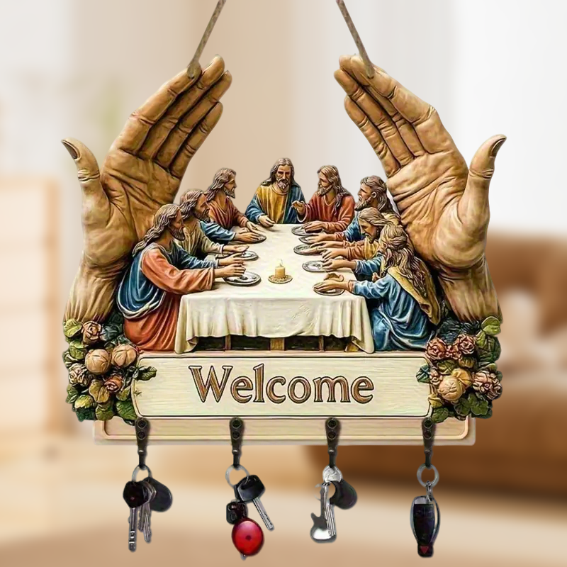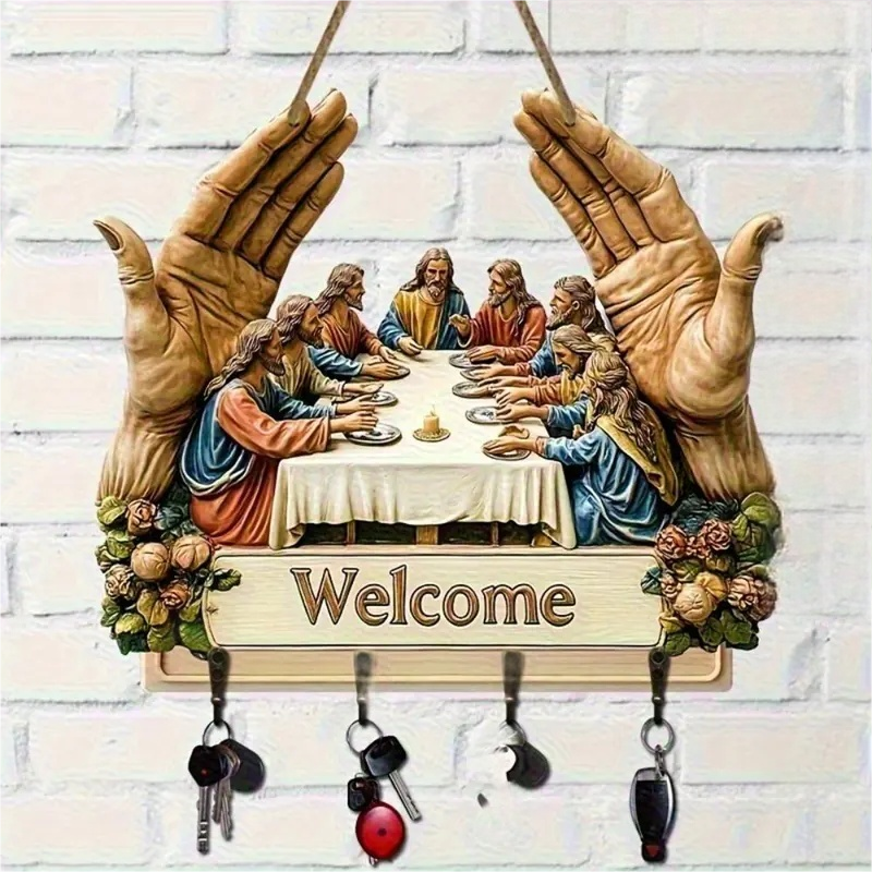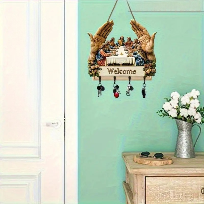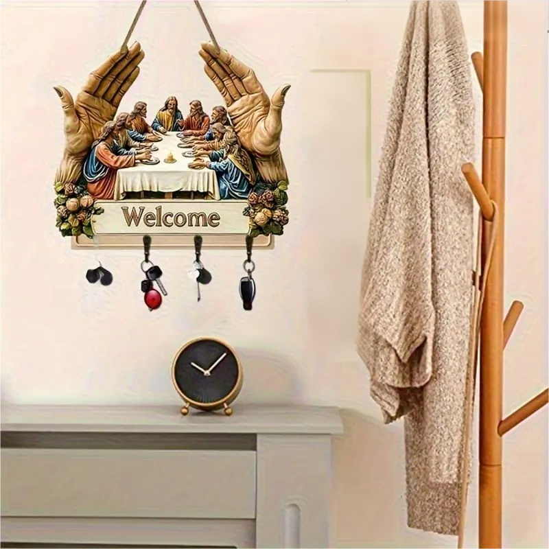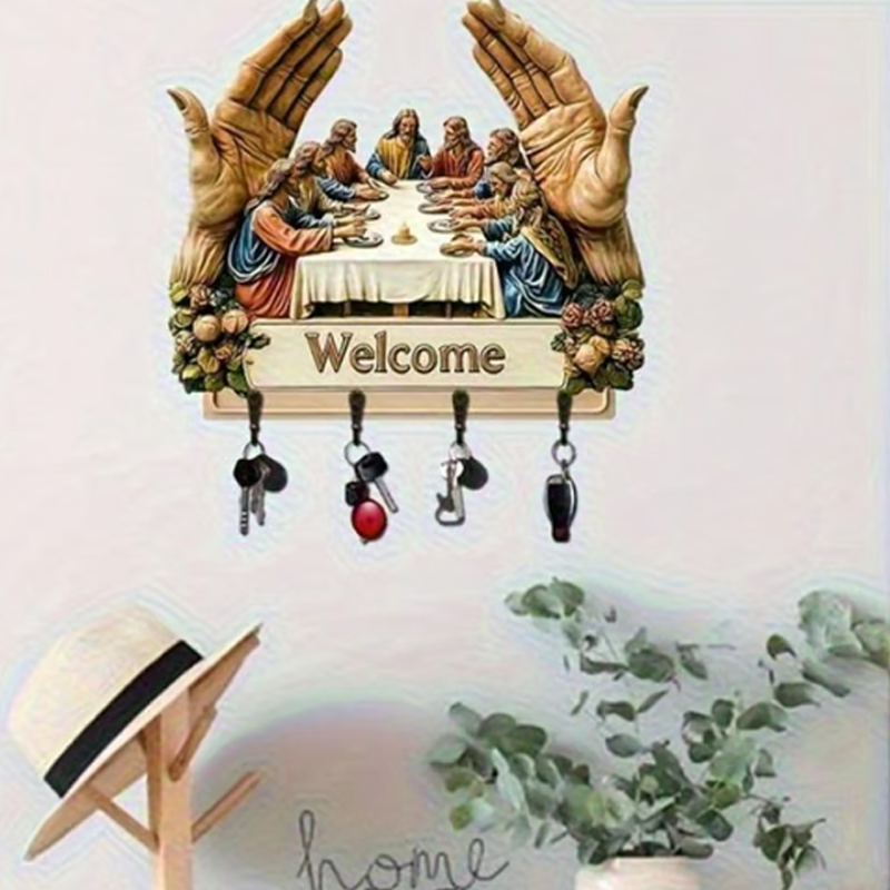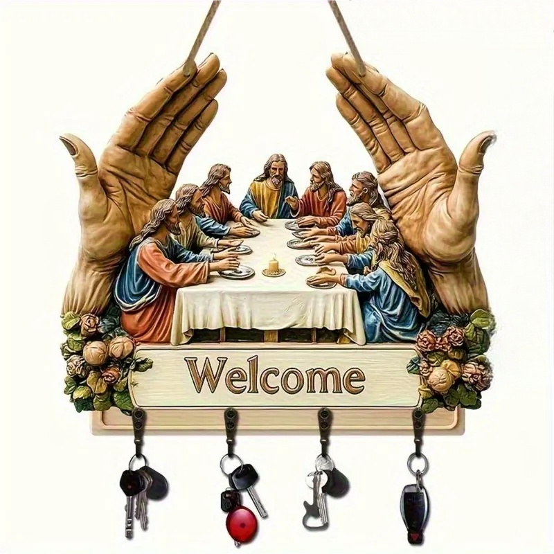 KLASSZIKUS MŰVÉSZETI TERVEZÉS: Ez a fából készült kulcstartó az ikonikus „Utolsó vacsora” motívummal időtálló szépséggel gazdagítja a belső tereket. Művészi nyomata eleganciát kölcsönöz, miközben ötvözi a dekorativitást a funkcionalitással, és egy egyszerű fali kiegészítőt jelentőségteljes műalkotássá alakít az otthon számára.